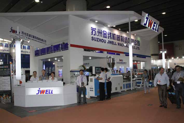 金緯機械對雅式展向來非常重視,本次展會,我司分別在1.1館和5.1館租用了700多平方米的展區,展示了新型塑料擠出機,波紋管臥式成型機,1600真空箱,瓦楞板成型,中空塑料成型機,高產量三輥壓光機,擠出平模頭,大型精密工業用輥筒,破碎機,塑料回收輔助設備等***新產品。***展示了金緯機械技術創新、節能環保、產量高、性能優的產品特征。